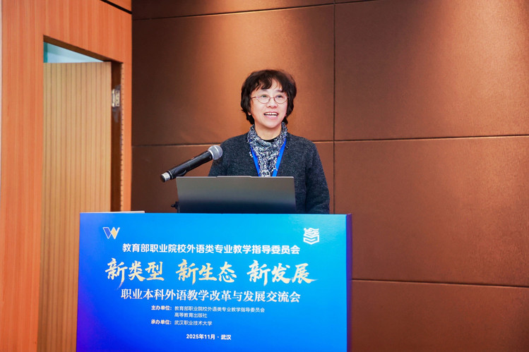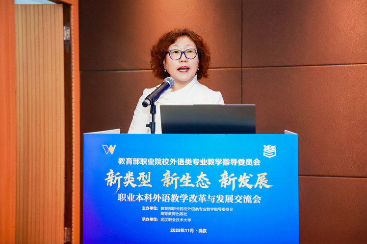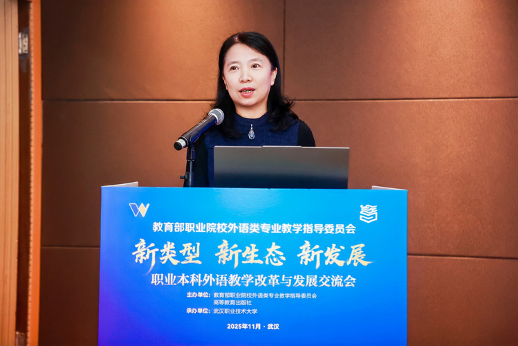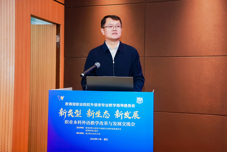 武汉职业技术大学党委副书记、校长何?;沓邪旆街禄队?,他表示职业本科外语教学改革是新时代职业教育“必答题”,学校将持续探索职业导向的公共外语教学新体系,与各界共谋高质量发展新蓝图。